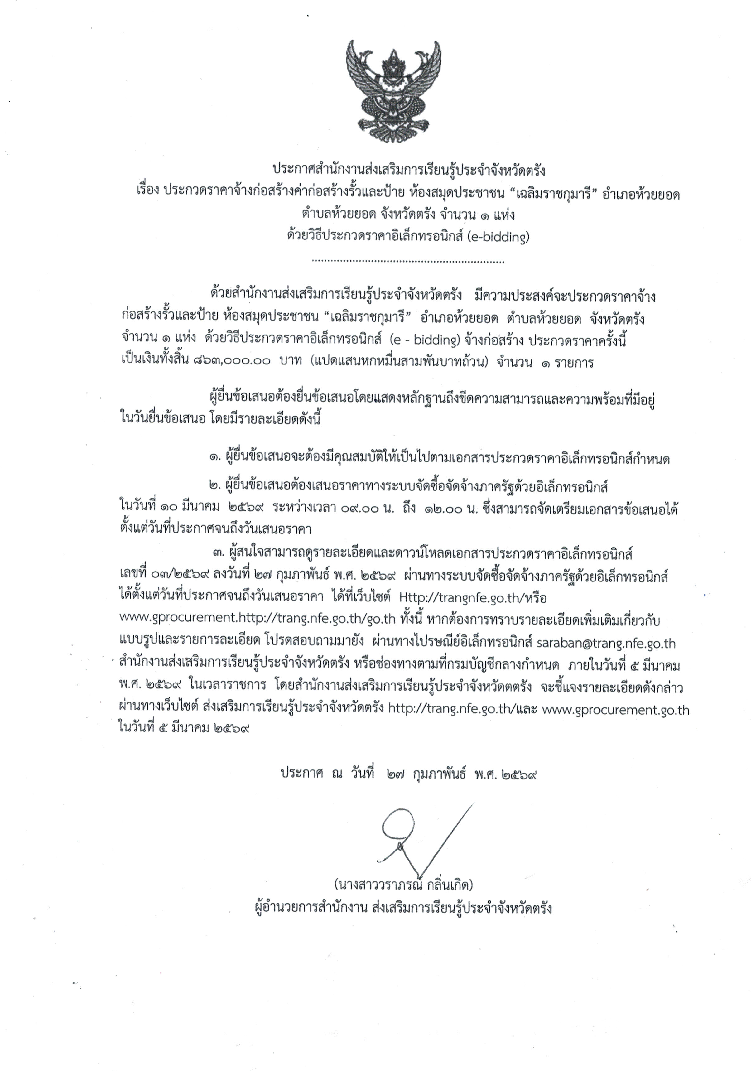 ประกาศ สำนักงาน สกร.ประจำจังหวัดตรัง เรื่อง ประกวดราคาจ้างก่อสร้างค่าก่อสร้างรั้วและป้าย ห้องสมุดประชาชน “เฉลิมราชกุมารี” อำเภอห้วยยอด ตำบลห้วยยอด จังหวัดตรัง จำนวน ๑ แห่ง ด้วยวิธีประกวดราคาอิเล็กทรอนิกส์ (e-bidding) 27 ก.พ. 256927 ก.พ. 2026ภาสกร กานต์รวีวงศ์ประกาศ, ประชาสัมพันธ์ กิจกรรม สกร.ประจำจังหวัดตรัง จำนวนผู้เข้าชม: 8