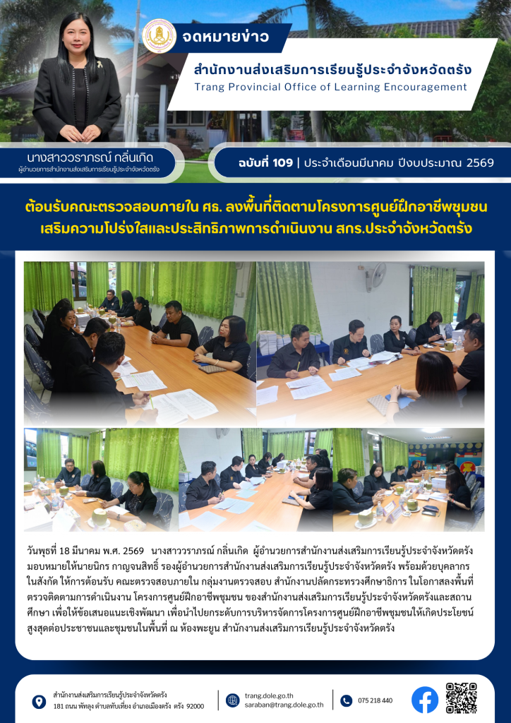 ต้อนรับคณะตรวจสอบภายใน ศธ. ลงพื้นที่ติดตามโครงการศูนย์ฝึกอาชีพชุมชน เสริมความโปร่งใสและประสิทธิภาพการดำเนินงาน สกร.ประจำจังหวัดตรัง 19 มี.ค. 2569สายธาร ทองรักษ์ประชาสัมพันธ์ กิจกรรม สกร.ประจำจังหวัดตรัง, ประชาสัมพันธ์ กิจกรรม สถานศึกษา จำนวนผู้เข้าชม: 11