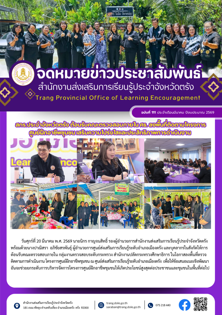 สกร.ประจำจังหวัดตรังและสกร.ระดับอำเภอเมืองตรัง ต้อนรับคณะตรวจสอบภายใน ศธ. ลงพื้นที่ติดตามโครงการ ศูนย์ฝึกอาชีพชุมชน เสริมความโปร่งใสและประสิทธิภาพการดำเนินงาน 20 มี.ค. 2569สายธาร ทองรักษ์ประชาสัมพันธ์ กิจกรรม สกร.ประจำจังหวัดตรัง, ประชาสัมพันธ์ กิจกรรม สถานศึกษา จำนวนผู้เข้าชม: 2