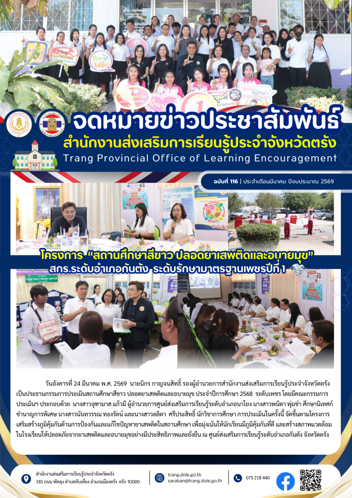 ประเมินสถานศึกษาสีขาว ปลอดยาเสพติดและอบายมุข ประจำปีการศึกษา 2568 ระดับรักษามาตรฐานเพชรปีที่ 1 สกร.ระดับอำเภอกันตัง 25 มี.ค. 2569สายธาร ทองรักษ์ประชาสัมพันธ์ กิจกรรม สกร.ประจำจังหวัดตรัง, ประชาสัมพันธ์ กิจกรรม สถานศึกษา จำนวนผู้เข้าชม: 3