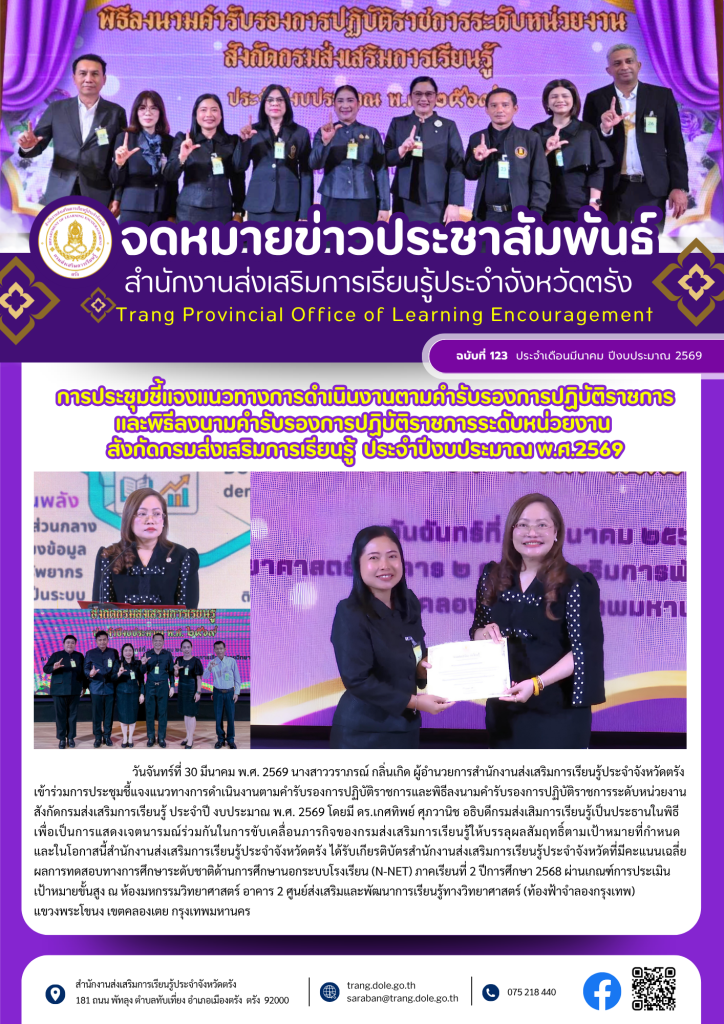 การประชุมชี้แจงแนวทางการดำเนินงานตามคำรับรองการปฏิบัติราชการและพิธีลงนามคำรับรองการปฏิบัติราชการระดับหน่วยงาน สังกัดกรมส่งเสริมการเรียนรู้ ประจำปีงบประมาณ พ.ศ. 2569 31 มี.ค. 25691 เม.ย. 2026สายธาร ทองรักษ์ประชาสัมพันธ์ กิจกรรม สกร.ประจำจังหวัดตรัง จำนวนผู้เข้าชม: 3