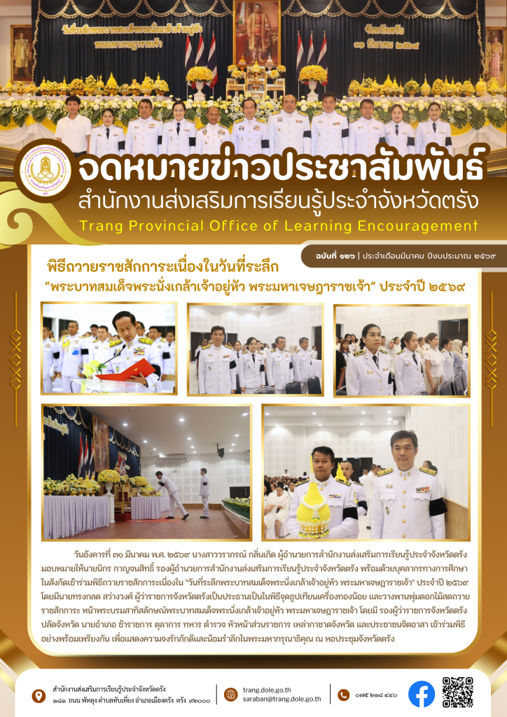 สำนักงาน สกร.ประจำจังหวัตรังเข้าร่วมพิธีถวายราชสักการะเนื่องใน “วันที่ระลึกพระบาทสมเด็จพระนั่งเกล้าเจ้าอยู่หัว พระมหาเจษฎาราชเจ้า” ประจำปี ๒๕๖๙ 31 มี.ค. 25691 เม.ย. 2026สายธาร ทองรักษ์ประชาสัมพันธ์ กิจกรรม สกร.ประจำจังหวัดตรัง จำนวนผู้เข้าชม: 5