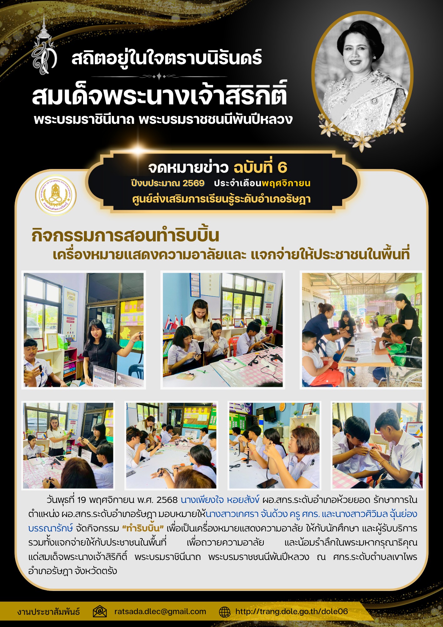 จัดกิจกรรม “ทำริบบิ้น” เพื่อเป็นเครื่องหมายแสดงความอาลัยให้กับนักศึกษา และผู้รับบริการ รวมทั้งแจกจ่ายให้กับประชาชนในพื้นที่ เพื่อถวายความอาลัย และน้อมรำลึกในพระมหากรุณาธิคุณแด่สมเด็จพระนางเจ้าสิริกิติ์ พระบรมราชินีนาถ พระบรมราชชนนีพันปีหลวง