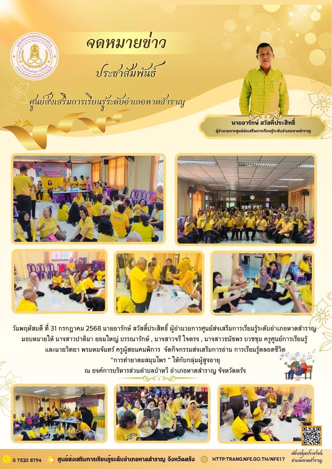 ประชาสัมพันธ์ วันพฤหัสบดี ที่ 31 กรกฎาคม 2568 นายอารักษ์ สวัสดิ์ประสิทธิ์ ผู้อำนวยการศูนย์ส่งเสริมการเรียนรู้ระดับอำเภอหาดสำราญ มอบหมายให้ นางสาวปาติมา ยอมใหญ่ บรรณารักษ์ , นางสาวจรี ใจตรง , นางสาวธนัชพร บวชชุม ครูศูนย์การเรียนรู้ และนายวิทยา พรมหมจันทร์ ครูผู้สอนคนพิการ จัดกิจกรรมส่งเสริมการอ่าน การเรียนรู้ตลอดชีวิต “การทำยาดมสมุนไพร “ ให้กับกลุ่มผู้สูงอายุ ณ องค์การบริหารส่วนตำบลบ้าหวี อำเภอหาดสำราญ จังหวัดตรัง 22 กันยายน 2025 จำนวนผู้เข้าชม: 3