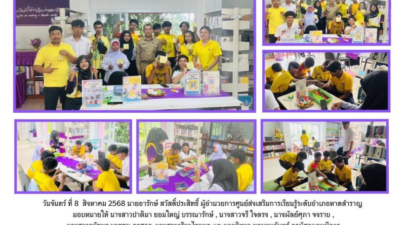 วันจันทร์ ที่ 8 กันยายน 2568 นายอารักษ์ สวัสดิ์ประสิทธิ์ ผู้อำนวยการศูนย์ส่งเสริมการเรียนรู้ระดับอำเภอหาดสำราญ มอบหมายให้ นางสาวปาติมา ยอมใหญ่ บรรณารักษ์ , นางสาวจรี ใจตรง , นางผัลย์ศุภา จงราบ , นางสาวธนัชพร บวชชุม ครูศกร. ,นางสาววริยาไชยมล และนายวิทยา พรมหมจันทร์ ครูผู้สอนคนพิการ จัดกิจกรรมส่งเสริมการอ่านการเรียนรู้ตลอดชีวิต “วันที่ระลึกสากลแห่งการรู้หนังสือ” โดยมีกิจกรรมประกอบด้วย 📚เพิ่มทักษะแห่งการเรียนรู้ ค้นคว้าหาความรู้ในห้องสมุด 📏bookmark ของฉัน 🧬DIY พวงกุญแจลวดกำมะหยีหรรษา ณ ห้องสมุดประชาชนอำเภอหาดสำราญ อำเภอหาดสำราญ จังหวัดตรัง